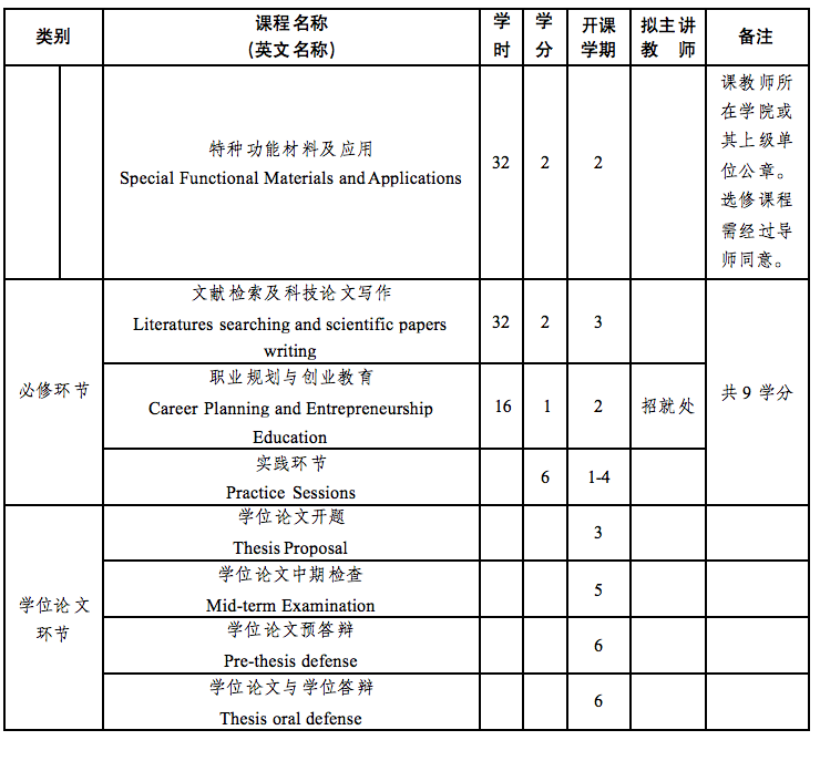 必修环节:文献检索及科技论文写作2学分;职业规划与创业教育1学分;实践环节(包含教学实践、学术实践) 6学分;共9学分。