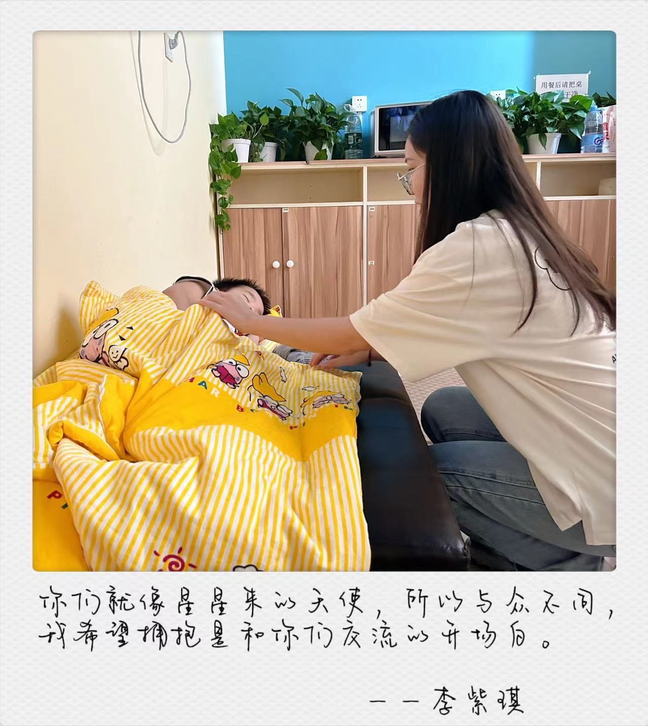他们帅气、漂亮、可爱、活泼,他们需要更多的爱和关怀,这群“星星的孩子”,一人一个世界,独自闪着自己光芒。在陪护的过程中,不仅更进一步了解了那群可爱的孩子,让孩子们感受到我们的关爱,也让我们更了解了自己。——杨思佳