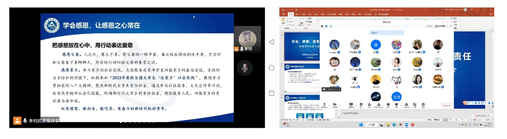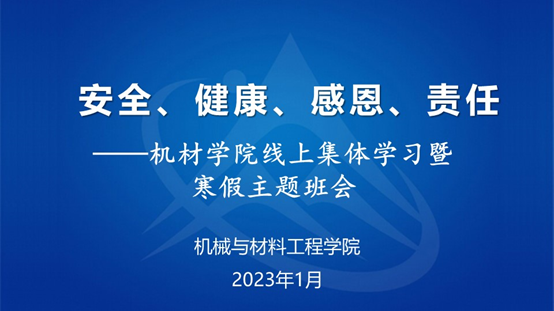 为贯彻落实公司《关于2023年元旦、寒假放假工作安排的通知》文件要求,帮助同学们合理规划老员工涯,进一步增强安全意识、底线意识,引导同学们度过一个充实又有意义的寒假。2023年1月16日至20日,yl23455永利面向全体本科生、研究生组织各班开展了以“安全、健康、感恩、责任”为主题的线上集体学习暨寒假主题班会和研究生组会,确保寒假期间员工工作开启“不断线、常更新”模式。