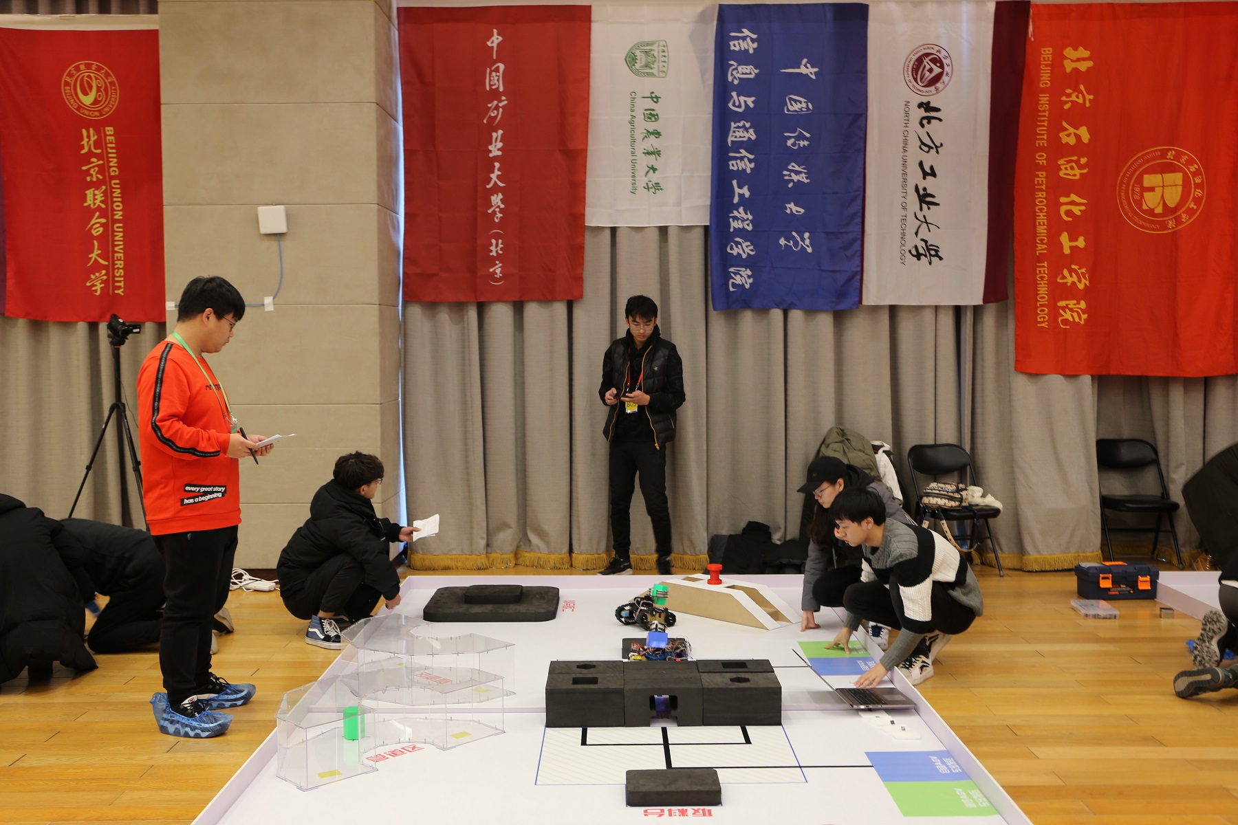 本届竞赛主题为“智能机器人”,包括“智能物流机器人竞赛”项目、“全地形搬运小车竞赛”项目和 “工程文化知识竞赛”等3个项目。此次竞赛呈现出了“创新与传统并存、竞技与合作共舞”的特点,并首次在智能物流机器人竞赛决赛时加入虚拟社区竞赛环节,持续8个小时的现场设计、加工、调试,注重过程性,考察团队合作能力、沟通能力、工程实践能力;全地形搬运小车竞赛采用遥控车与自动车相互配合进行物料的取料装配操作,对参赛选手均有很大挑战。
