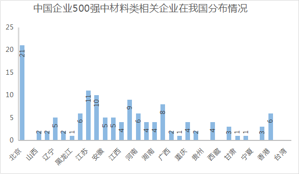 笔者在中国企业500强中筛选出138家主要涉及材料类的企业。从图中我们能看出中国500强材料类企业总部地域主要集中在北京(21家)、江苏(11家)、浙江(10家)山东(9家)、广东(8家)五省。而天津、贵州、宁夏、澳门、香港没有。